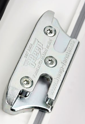 Beim Schließen des Fensters hakt sich der Pilzkopfschließzapfen in dem dazu passenden Stahlschließblech (Anlehnung an RC2) ein.